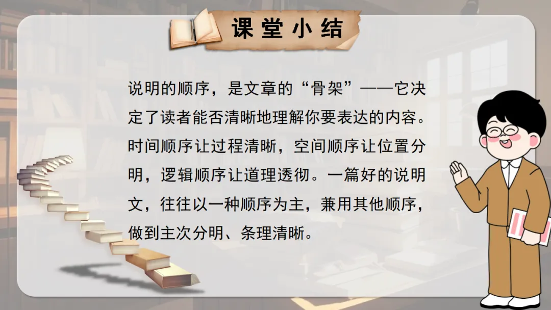 说明的顺序,是文章的“骨架”——它决定了读者能否清晰地理解你要表达的内容。时间顺序让过程清晰,空间顺序让位置分明,逻辑顺序让道理透彻。一篇好的说明文,往往以一种顺序为主,兼用其他顺序,做到主次分明、条理清晰。