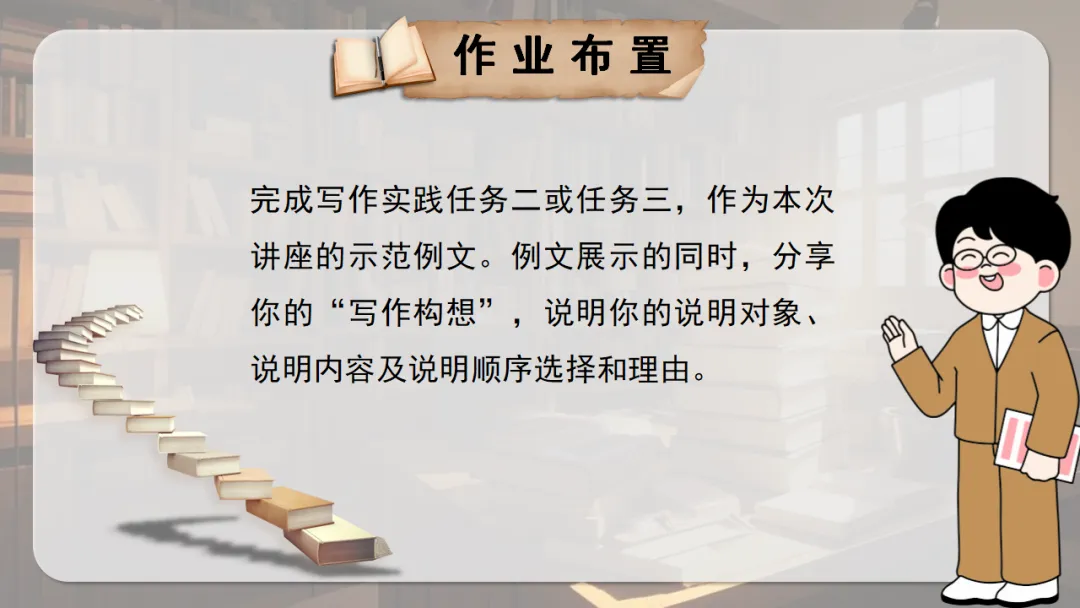 完成写作实践任务二或任务三,作为本次讲座的示范例文。例文展示的同时,分享你的“写作构想”,说明你的说明对象、说明内容及说明顺序选择和理由。