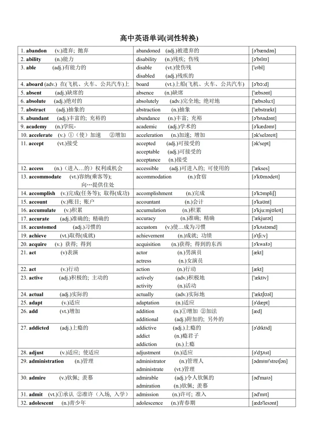 高考英语必须掌握的重点词词性转换大全,可免费下载