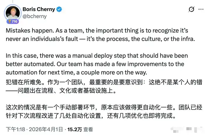 Claude Code 工程师 Boris Cherny 本人间接回应(“不是个人失误,是过程/文化问题”)