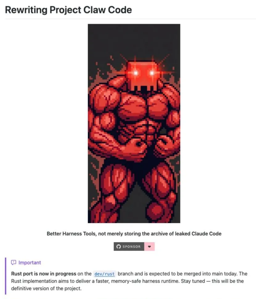 另外发现源码泄漏事件的首发作者已经不在托管泄漏代码,而是在把它改造成一个借泄露事件起势的、以 Python/Rust 重写 agent harness 为名义的开源项目。
