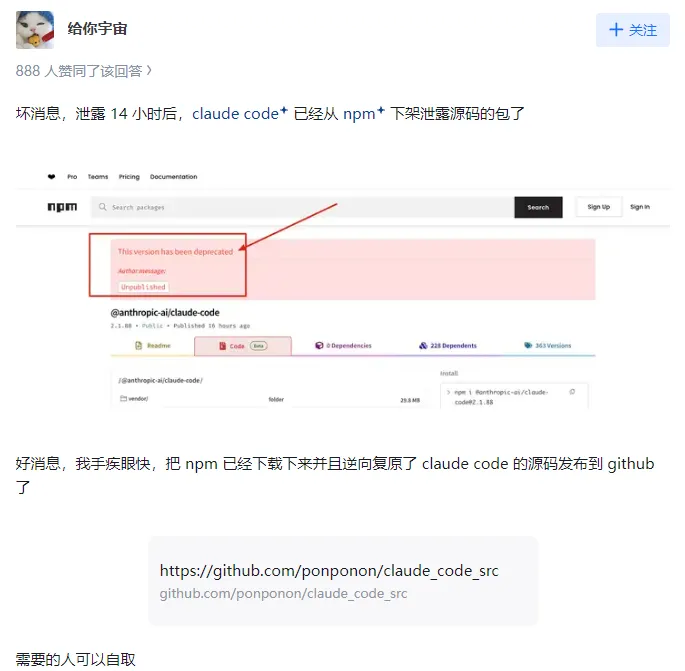 泄露 14 小时后,claude code 已经从 npm 下架泄露源码的包了。