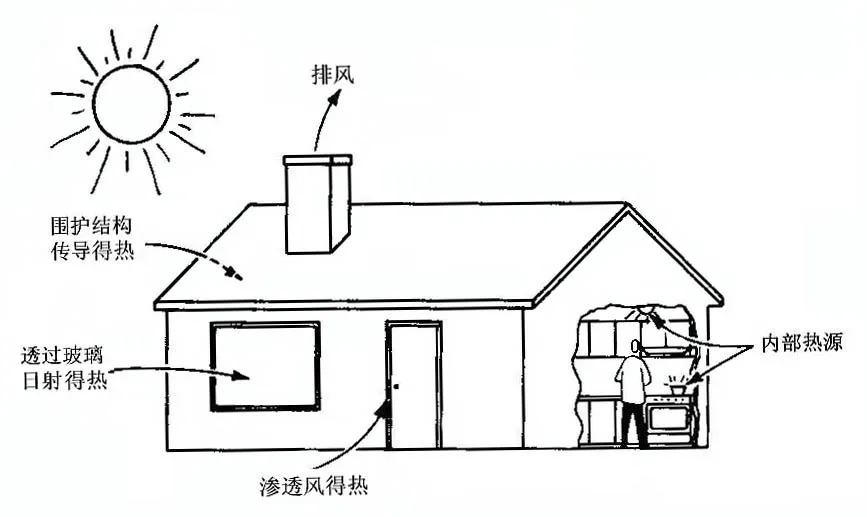 围护结构负荷:外墙、屋顶、地面导热,阳光透过玻璃直接得热,室内外温差导致热量传递。