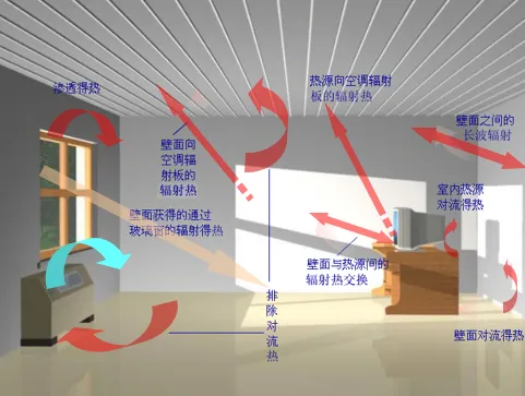 空调系统是依靠空气为媒介,带走室内的余热量。空气只能带走对流热量,却不能直接吸收辐射热量。当房间的得热量中含有辐射成份时,这部分辐射成份必须经过吸收、反射、对流放热和辐射放热等多次过程才能使进入房间的辐射热量最终转化为对流热量被空调空气所带走。