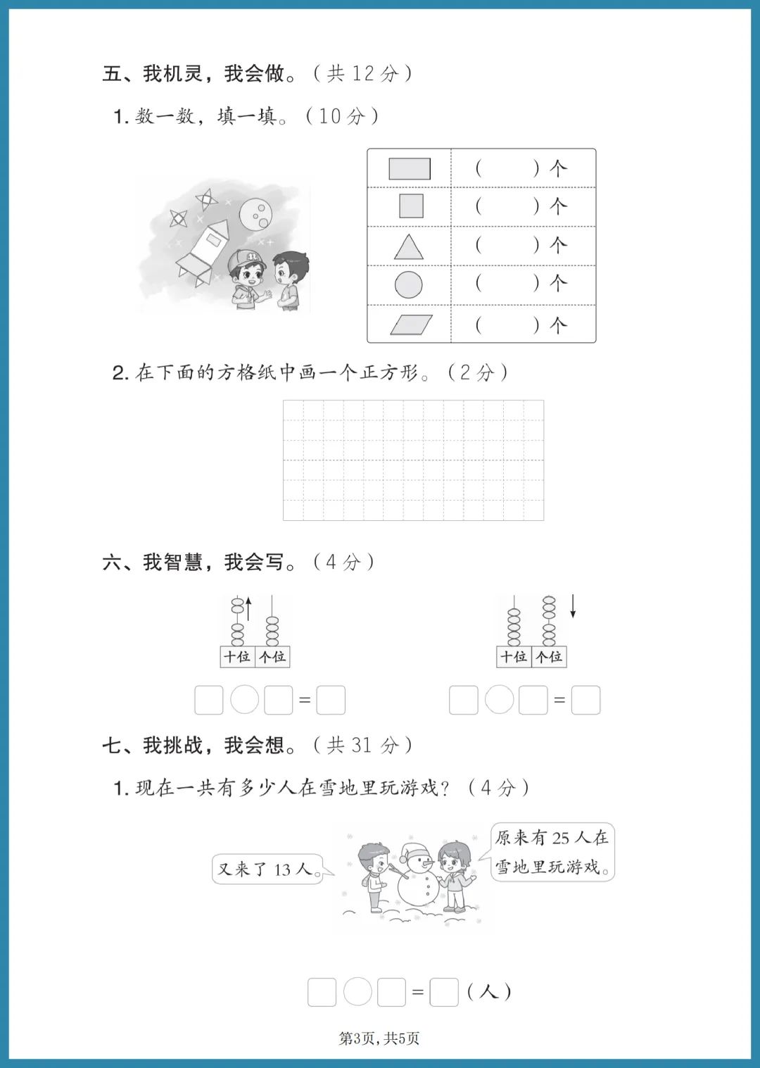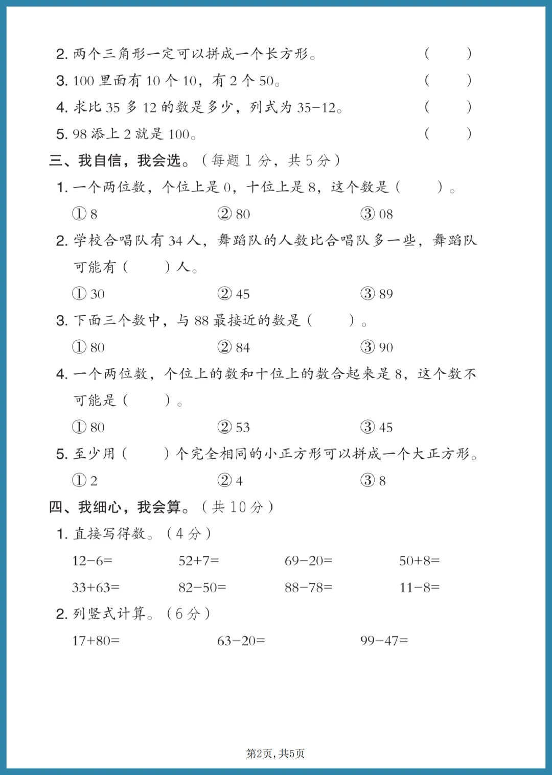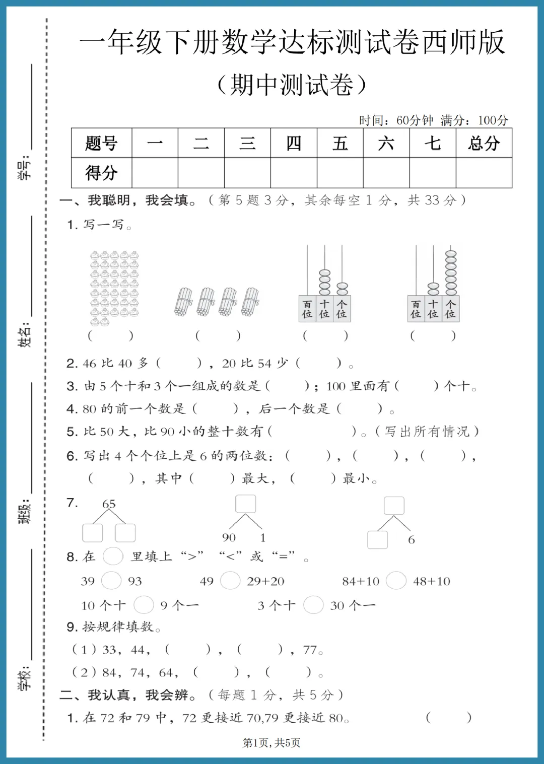 各位家长看过来!这份 2024 年西师版一年级下册数学期中达标测试卷来啦,共 5 页精编内容。试卷紧扣教材重点,涵盖前半学期核心知识点,题型丰富多样,能帮孩子全面查漏补缺,熟悉考试节奏,轻松建立自信心。考前练一练,效果大不同!需要资源的家长别犹豫,赶紧下载打印给孩子做一做,助力孩子期中拿高分,加油!