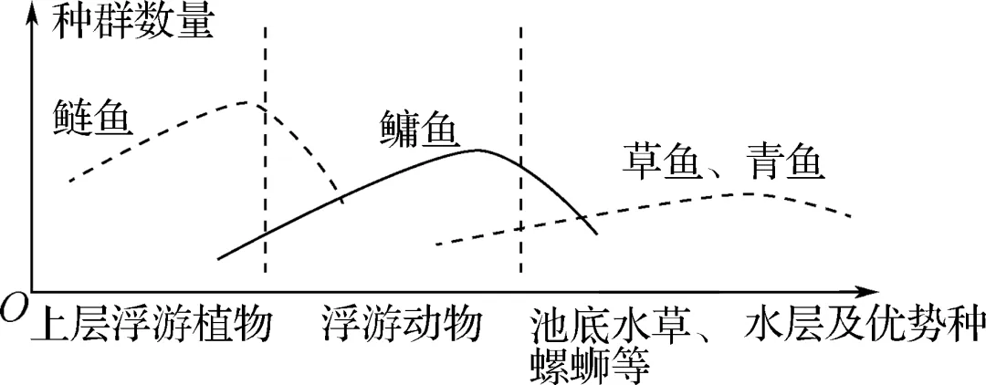 4. (2024·南京期末)我国劳动人民在明代就已经将鲢鱼、鳙鱼、草鱼、青鱼四大家鱼混养以提高效益。如图表示某池塘中四大家鱼及其食物的分布,下列相关分析正确的是(B)