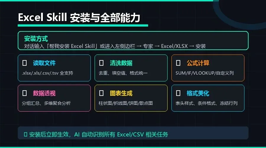 或者进入左侧边栏的 “专家” 入口,找到 “Excel / XLSX” Skill,点击安装。