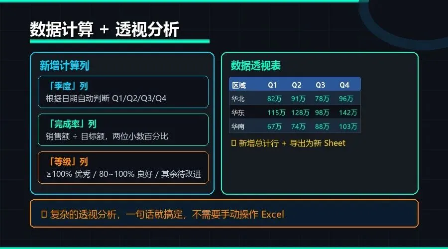 「季度」列:根据日期自动判断 Q1/Q2/Q3/Q4 「完成率」列:销售金额 ÷ 目标金额,保留两位小数,显示为百分比 「等级」列:完成率 ≥ 100% 标为「优秀」,80%~100% 标为「良好」,其余标为「待改进」