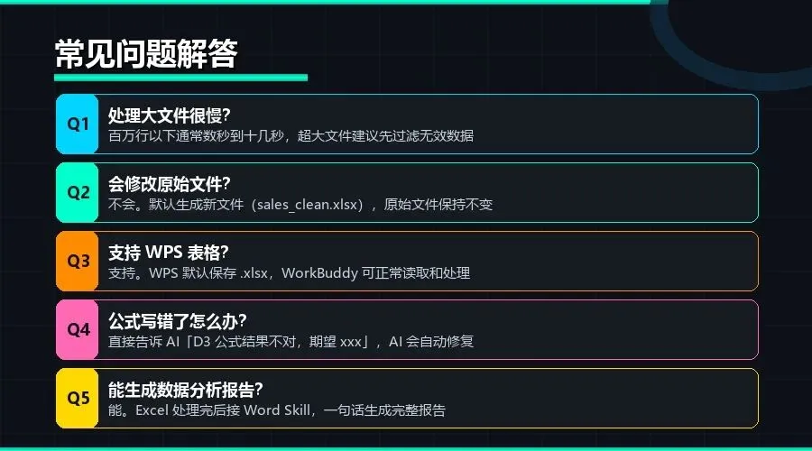 不会。WorkBuddy 默认生成新文件(在原文件名后加 _clean、_final等后缀),原始文件保持不变。如果需要覆盖原文件,请在指令中明确说”覆盖原文件”。