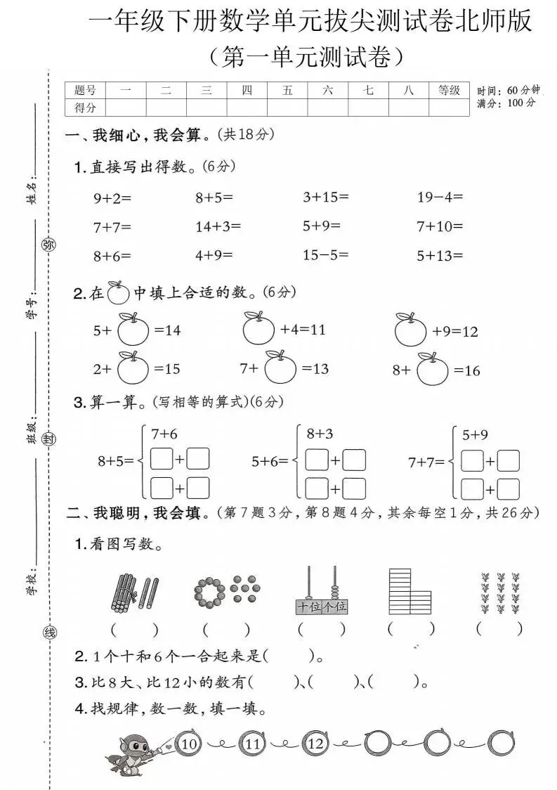 2026春北师大版数学一年级下册《第一单元测试卷》共2套,(有答案),可打印