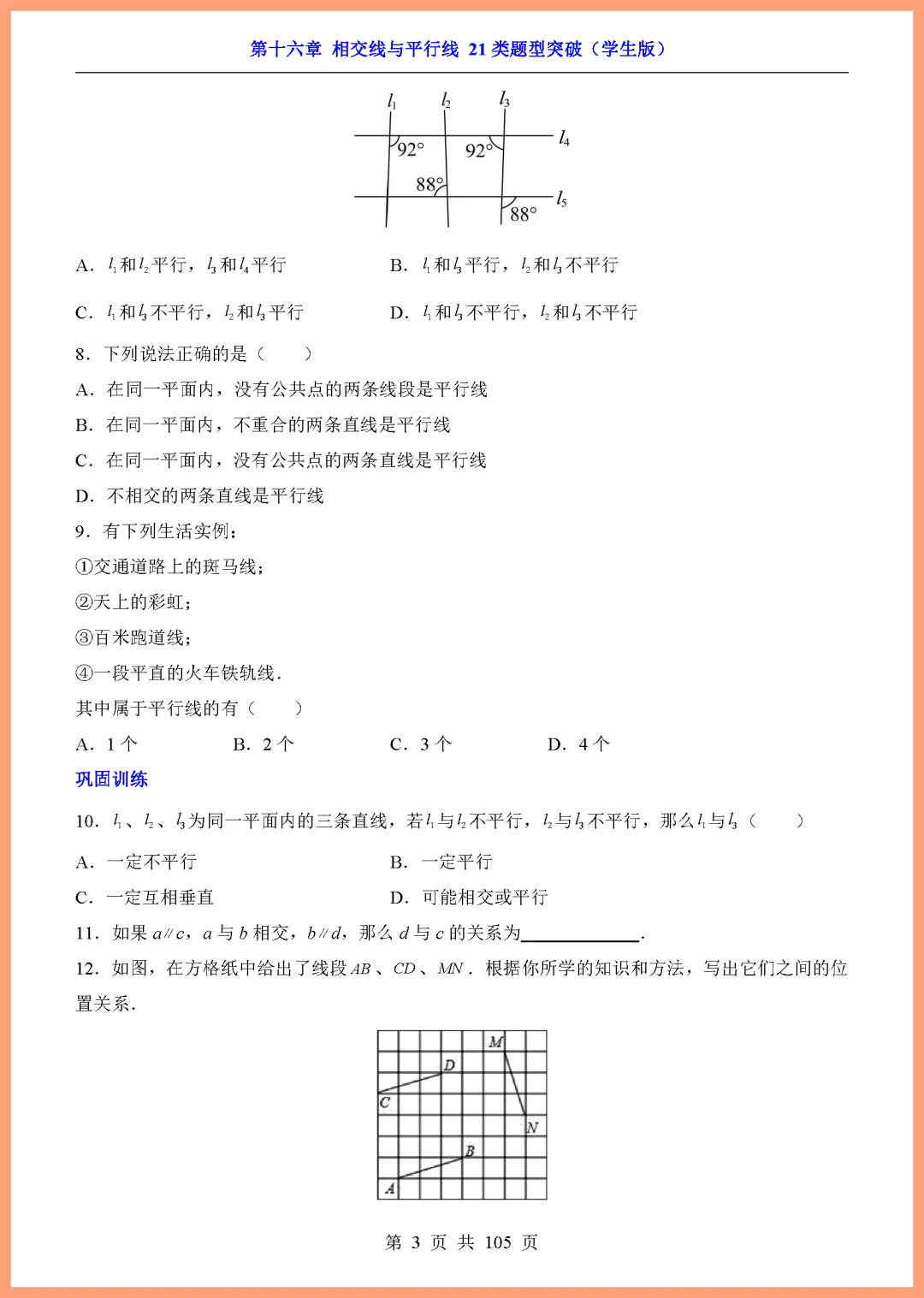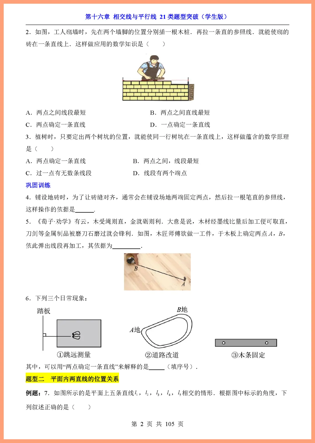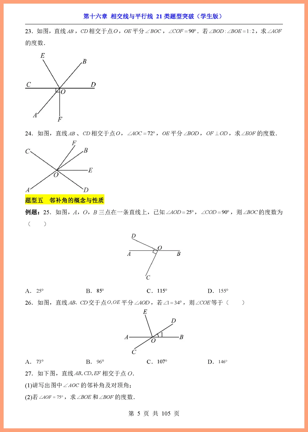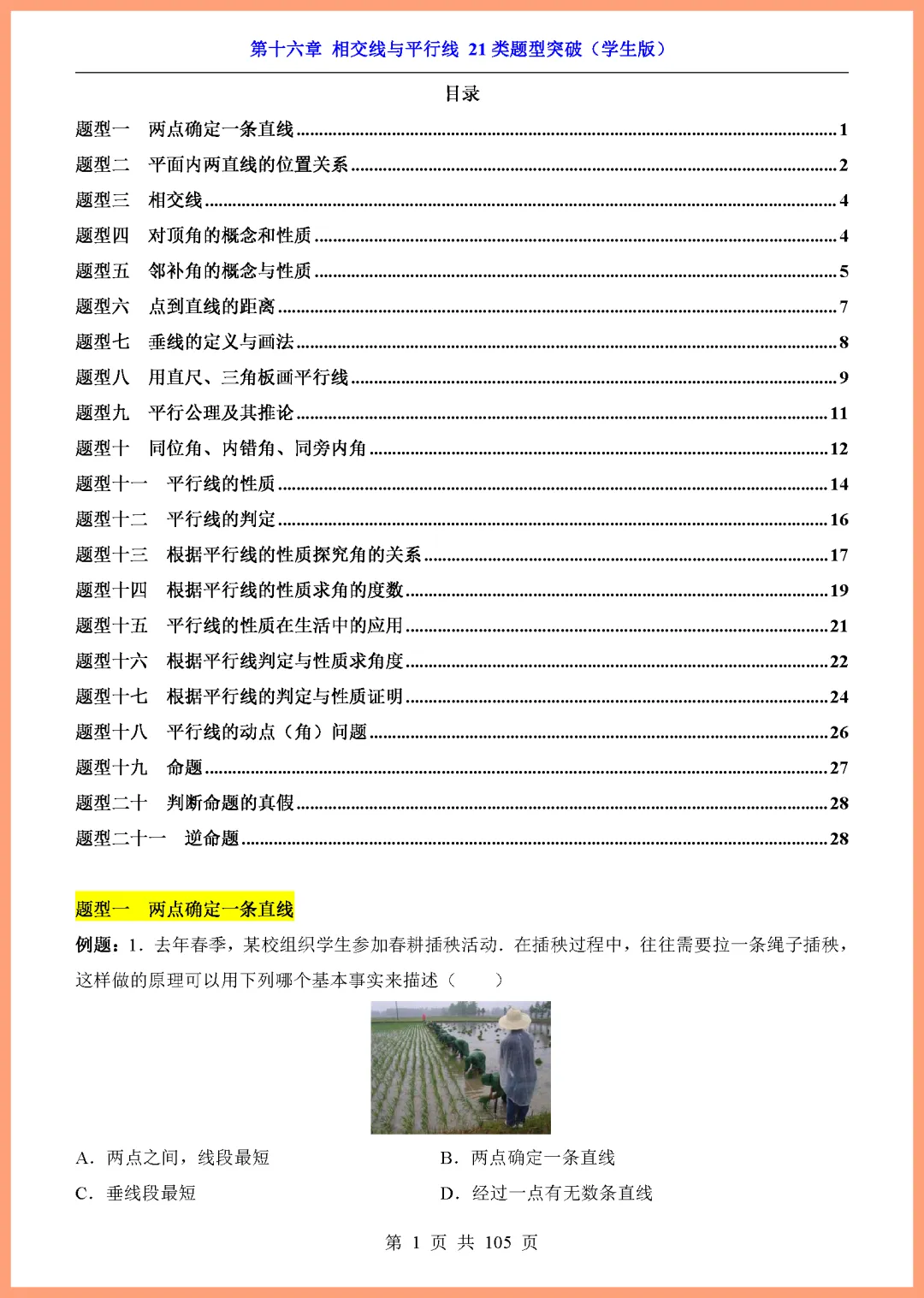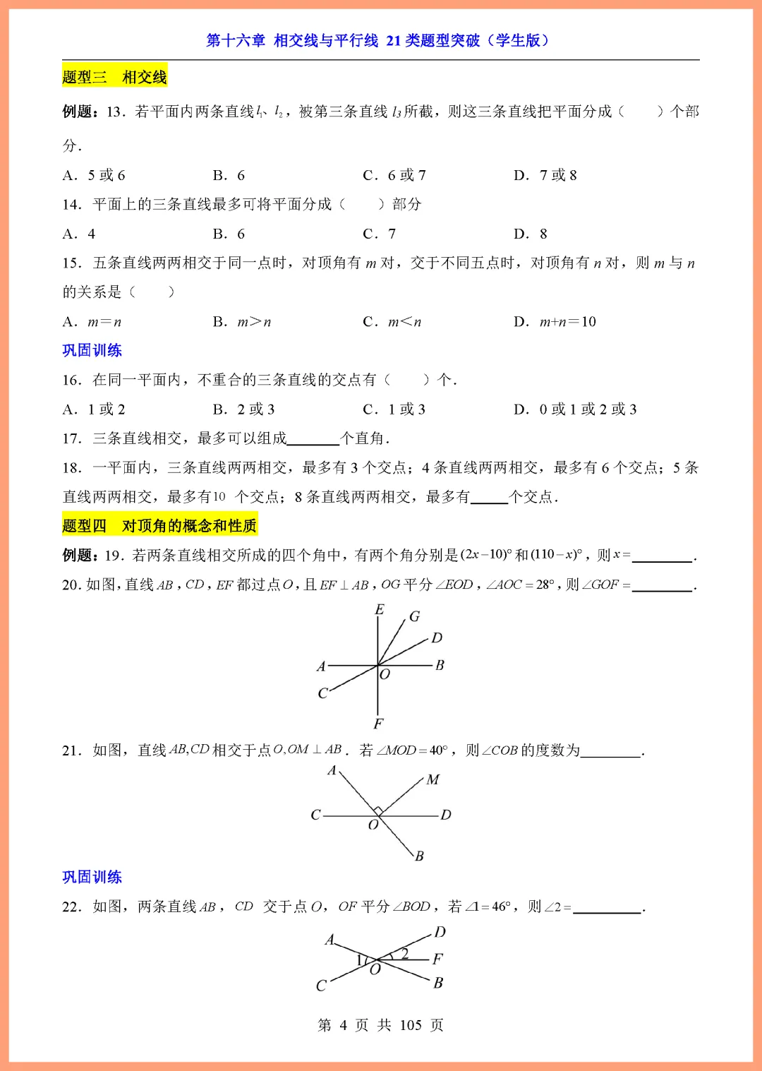 家长朋友们看过来!这份专为七年级下学期打造的沪教 54 版数学资料,聚焦第 16 章“相交线与平行线”,整整 105 页干货满满。书中精心梳理了 21 类核心题型,从基础概念到复杂证明,层层递进,帮助孩子彻底吃透几何难点,轻松构建解题思维,考试不再丢分。想要孩子数学成绩稳步提升?别犹豫了,赶紧下载打印出来,让孩子趁热打铁练一练,掌握方法,自信迎考!