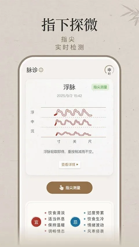 通过指尖测量和手表测量即可测量当日脉象,为您的中医养生提供科学依据。