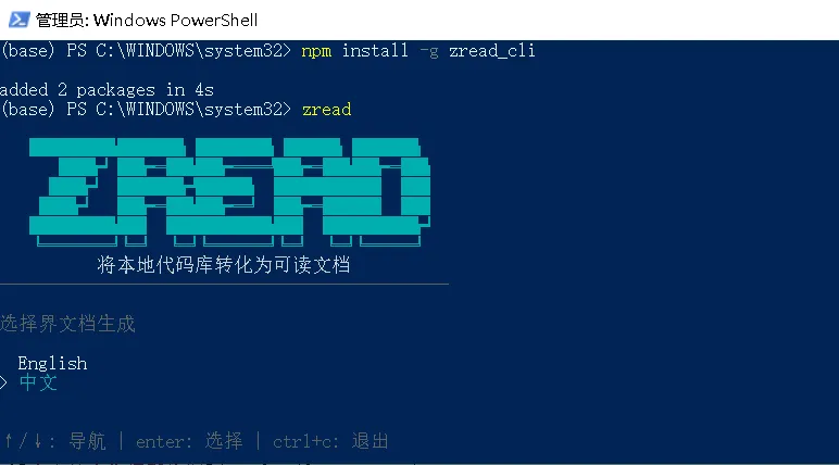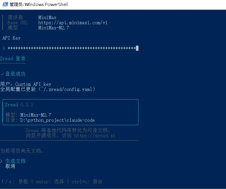 官方说明中,zread 是默认入口命令:进入项目目录后直接运行 zread,CLI 会根据当前状态推荐下一步操作(登录、生成文档、打开文档等)。