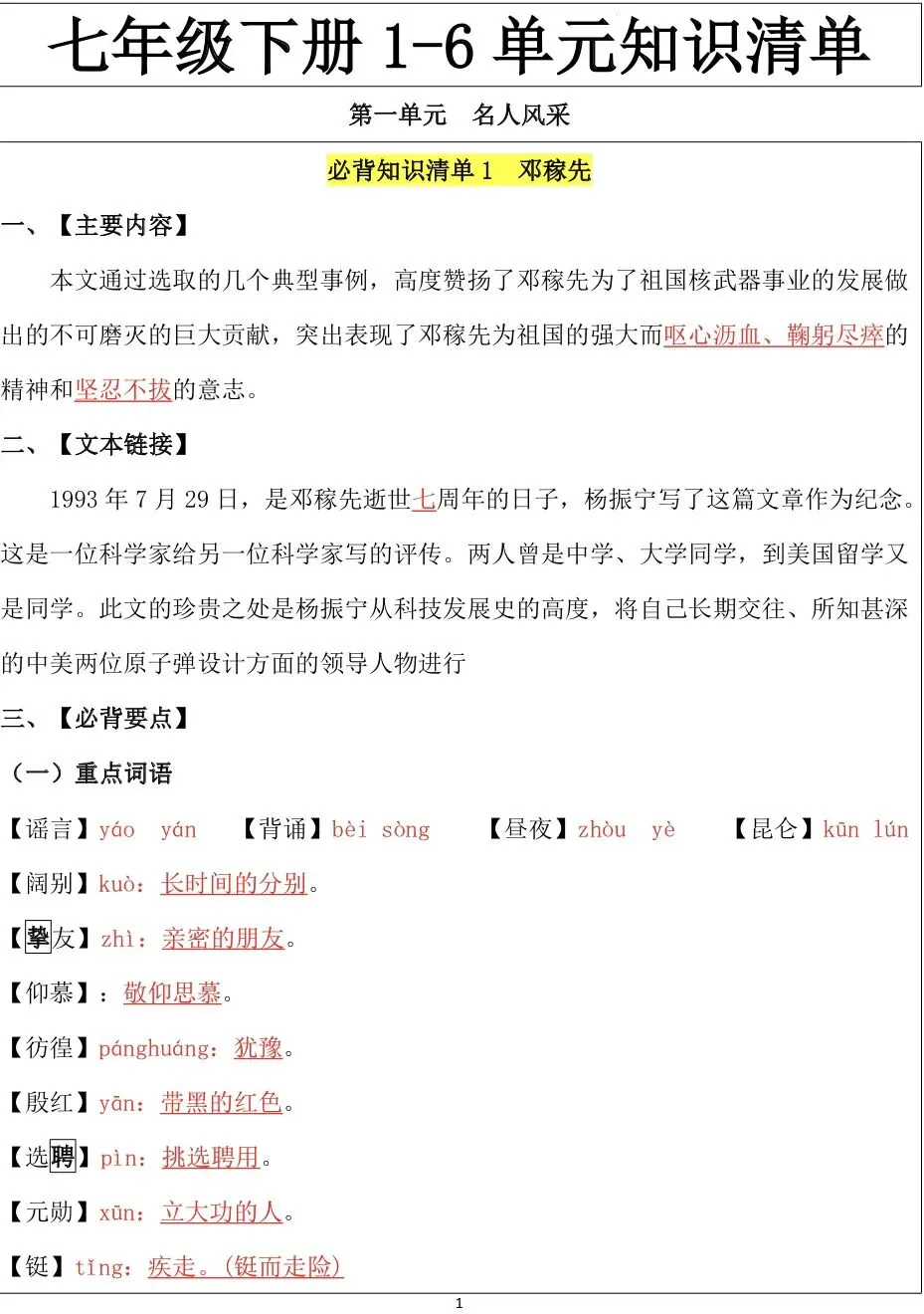 七下语文|1-6单元必背知识清单(可打印电子版)