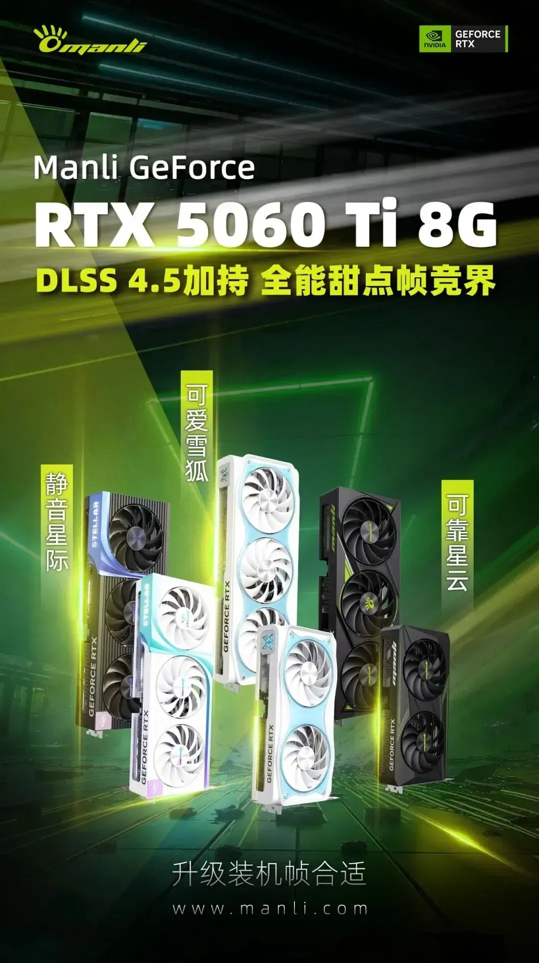 万丽 GeForce RTX 5060 Ti 8G 显卡以「静音星际」的深邃静谧、「可爱雪狐」的灵动萌趣、「可靠星云」的可靠实力,成为你的“全能甜点”装备!拥有4608个CUDA核心,配备8GB GDDR7显存,结合 DLSS 4 技术在 2K 分辨率下能流畅达成百帧效果,在 1080P 分辨率下更是能轻松应对。借助 NVIDIA App还可以开启全新的DLSS 4.5超分辨率技术,让全能甜点装备帧竞界!