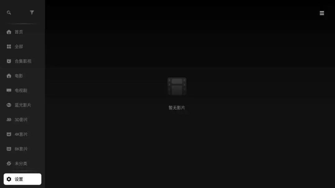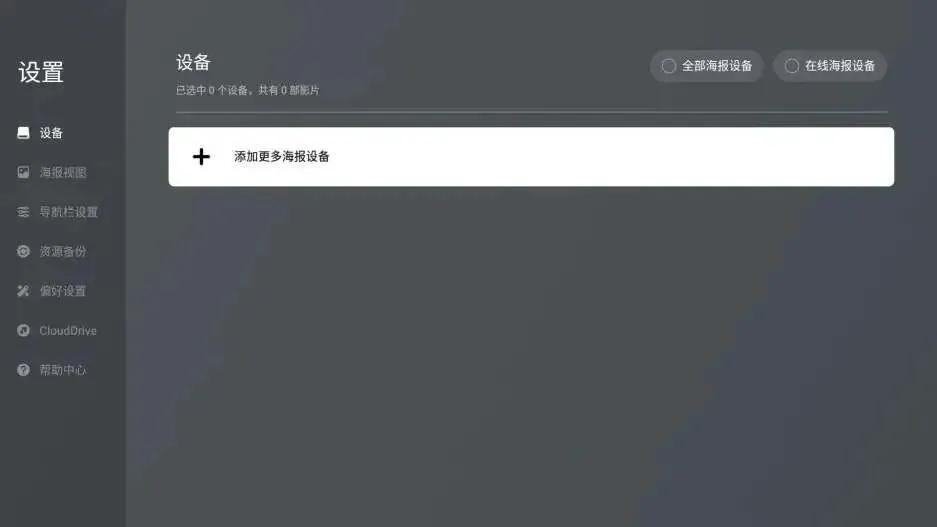 2、此时电影海报墙还是空白的,需添加海报设备,也就是选择电影存储的文件目录,操作步骤:点击高清影院内的设置,选择添加设备。