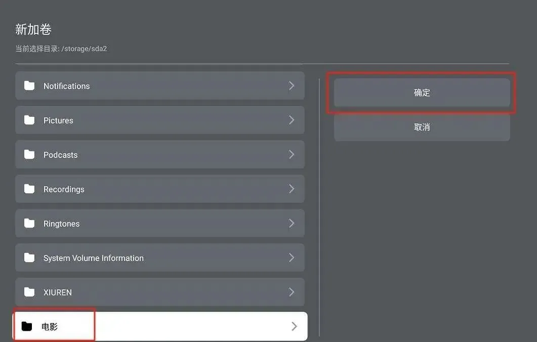 3、这里演示的电影是存储在nas设备,我们选择网络NFS服务,找到电影存储文件目录选择确定;操作步骤:选择所需扫描海报墙的目录,选确认。