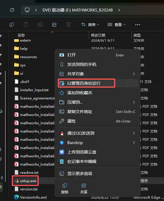 双击【R2024b_Windows.iso】,会弹出一个驱动磁盘,在里面找到【setup.exe】安装程序,右键【以管理员身份运行】