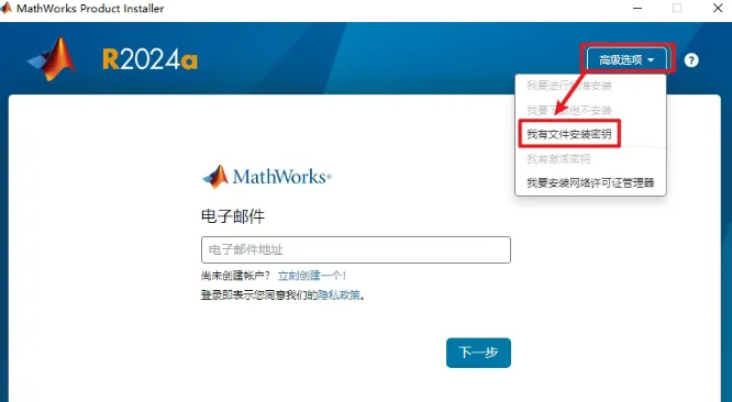 3.点右上角的【高级选项】,选择【我有文件安装密钥】。