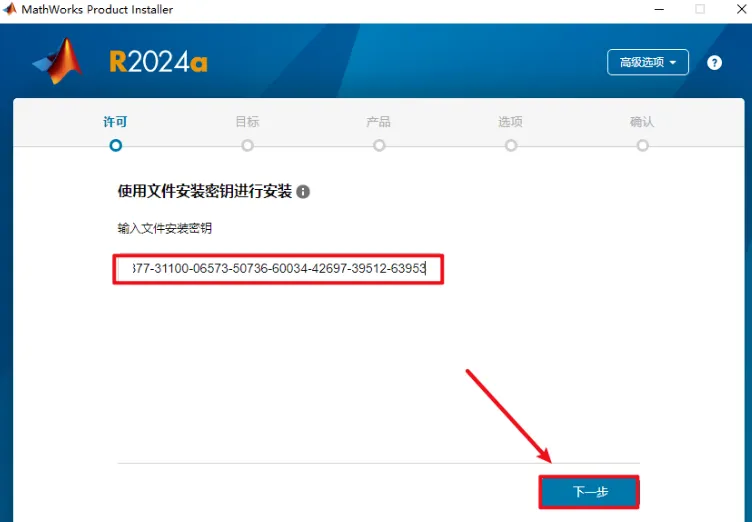 5.输入密钥【 39676-02743-14813-63132-22122-21739-42724-01237-08353-51560-41813-30272-46436-42021-53831-05395-21684-43572-58789-40638-42099-40160-19797-60670-44428-39867】(直接复制粘贴),点击【下一步】。