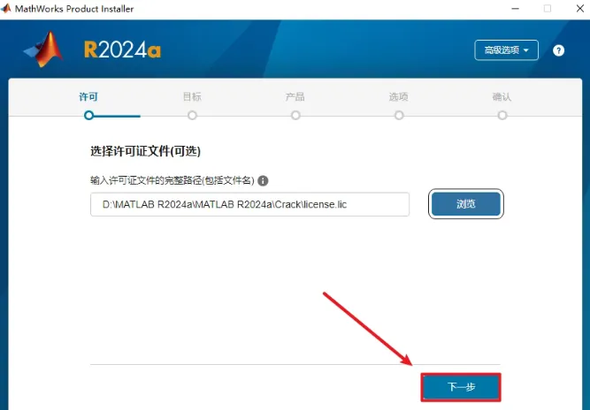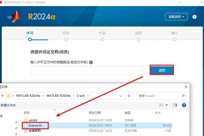 6.点击【浏览】。去到第一步解压的文件夹找到【crack】,打开里面找到【licese.lic】,点击【打开】。