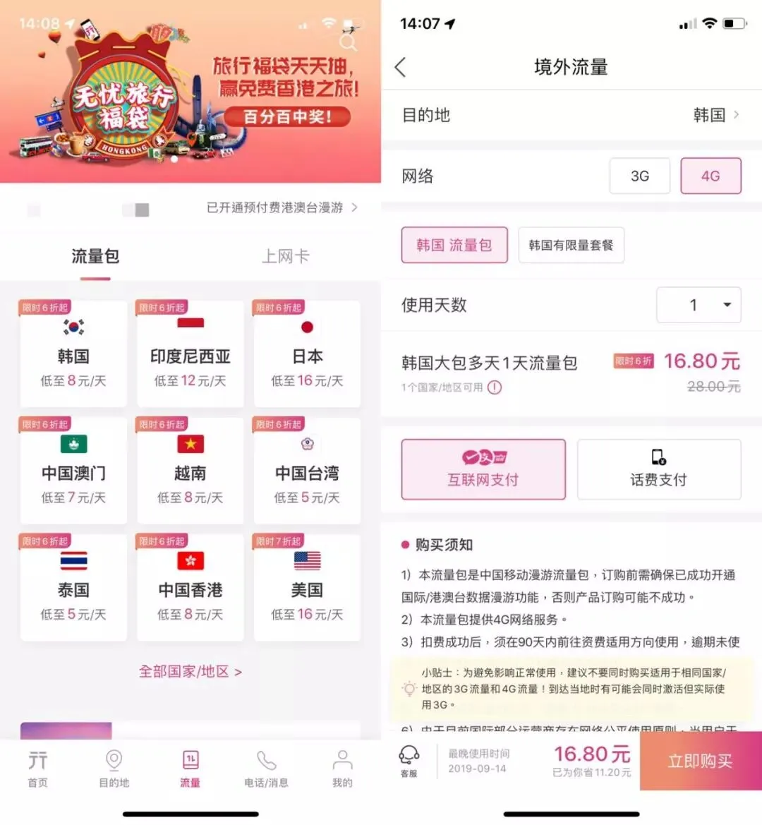 对于在境外刷信用卡剁手收不到消费信息的人来说,无忧行还可以收到各家银行的短信,再也不用回到国内才知道花了多少钱。因为无忧行的功能都需要网络实现,只要在旅游前,在无忧行上面就可以买到目的地的流量包,还可以选择购买天数,操作简单明了,出国之后就不用到处找WIFI了,全程讲究一个无痛体验。