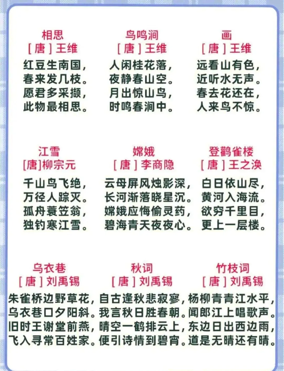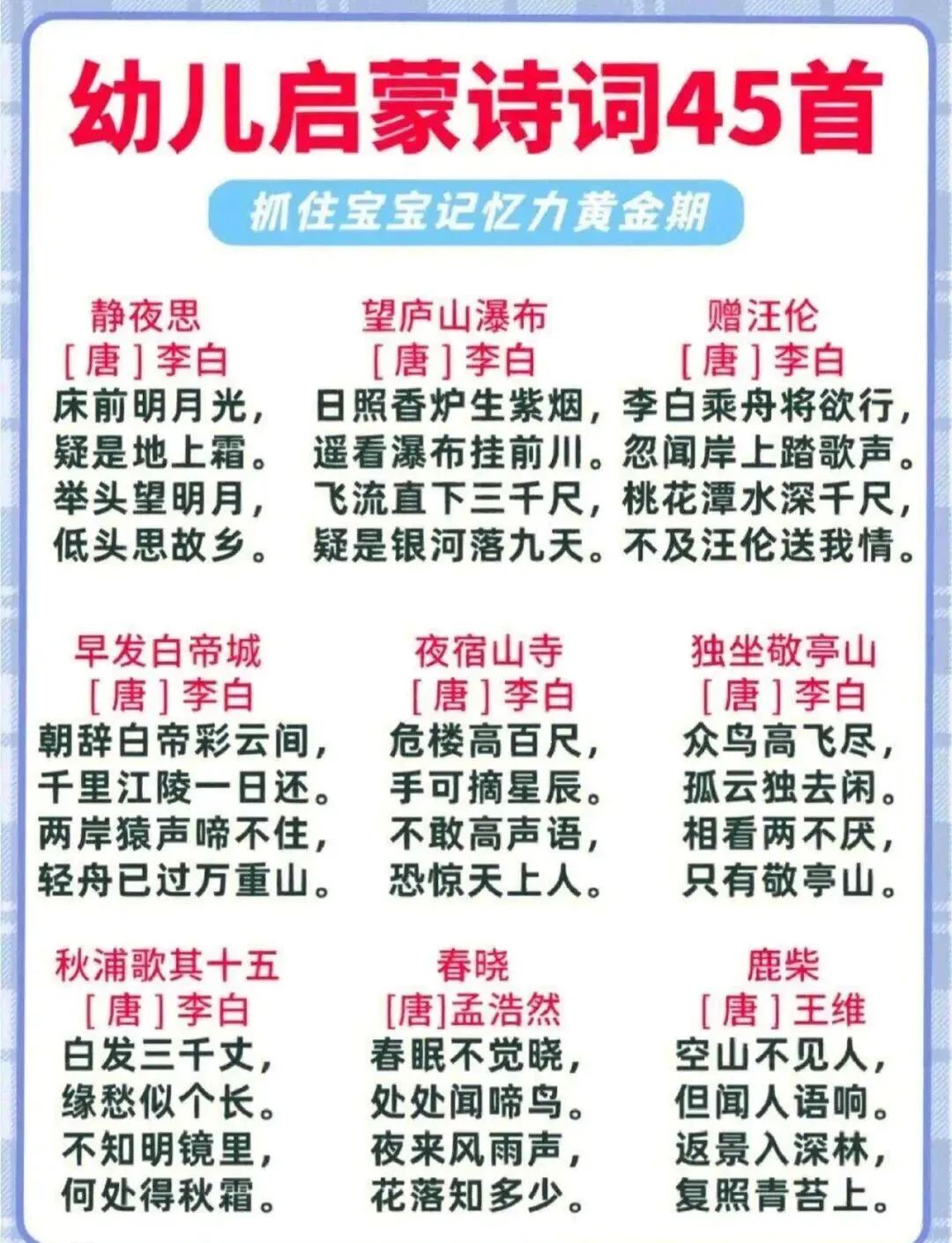 幼儿启蒙古诗词汇总(电子版) 今天给大家分享的是幼儿启蒙古诗词汇总,从《咏鹅》《春晓》到《悯农》,覆盖自然、生活、品德等主题,画面感强,孩子易理解、爱背诵。内容系统清晰,无冗余信息,家长可直接使用,晨起、睡前、出行途中都能学。 内容截图预览 限时免费领取: (公众号发文24小时内) 公众号对话框中发送关键字:11308