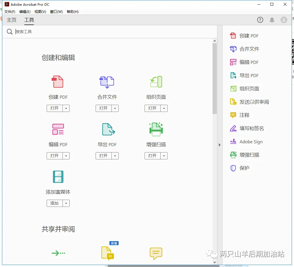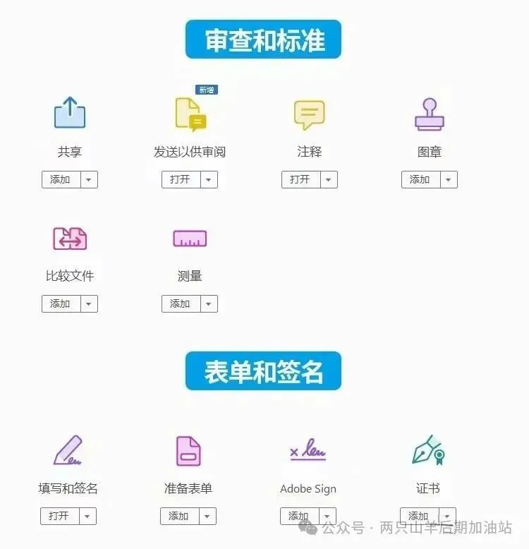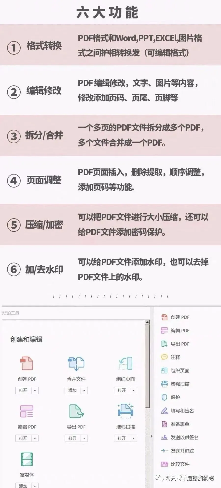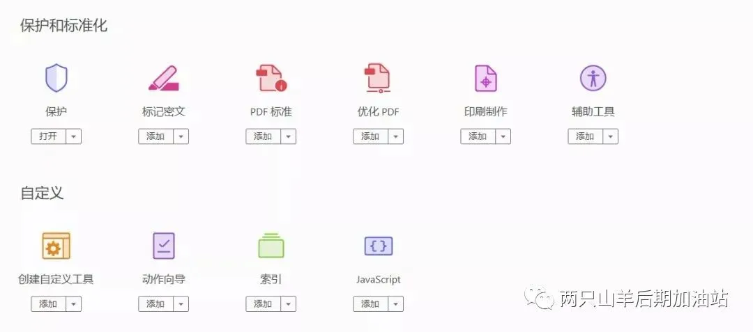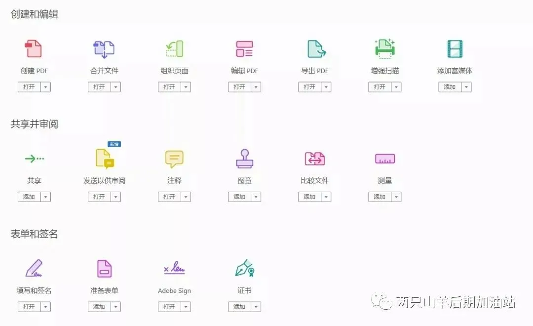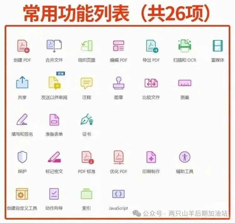 创建pdf、编辑pdf、导出pdf、注释、组织页面、增强扫描、保护、准备表单、合并文件、优化pdf、标记密文、图章、比较文档、发送以供注释、动作向导、创建自定义工具、印刷制作、pdf标准、证书、辅助工具、富媒体、javsscript、索引、测量……