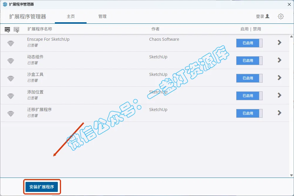 SketchUp2021及其以上版本:顶部菜单栏【扩展程序——扩展程序管理器】,