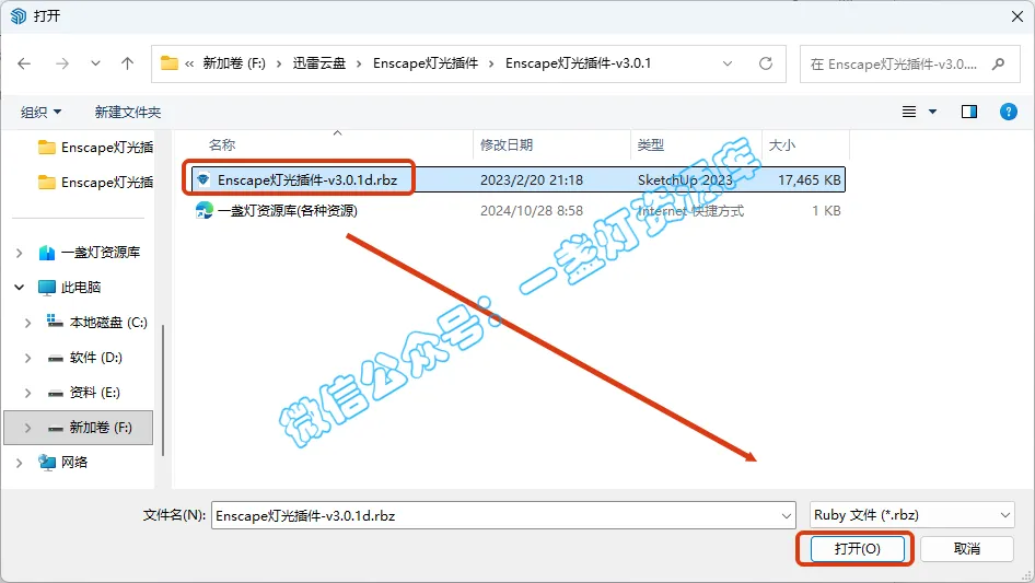 4.选择刚才解压的【Enscape灯光插件-v3.0.1】文件夹路径里面的【Enscape灯光插件-v3.0.1d】文件,点击【打开】