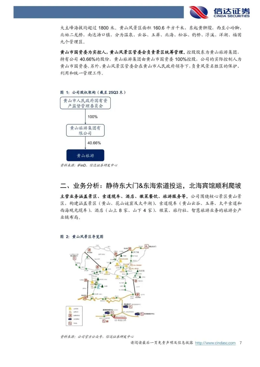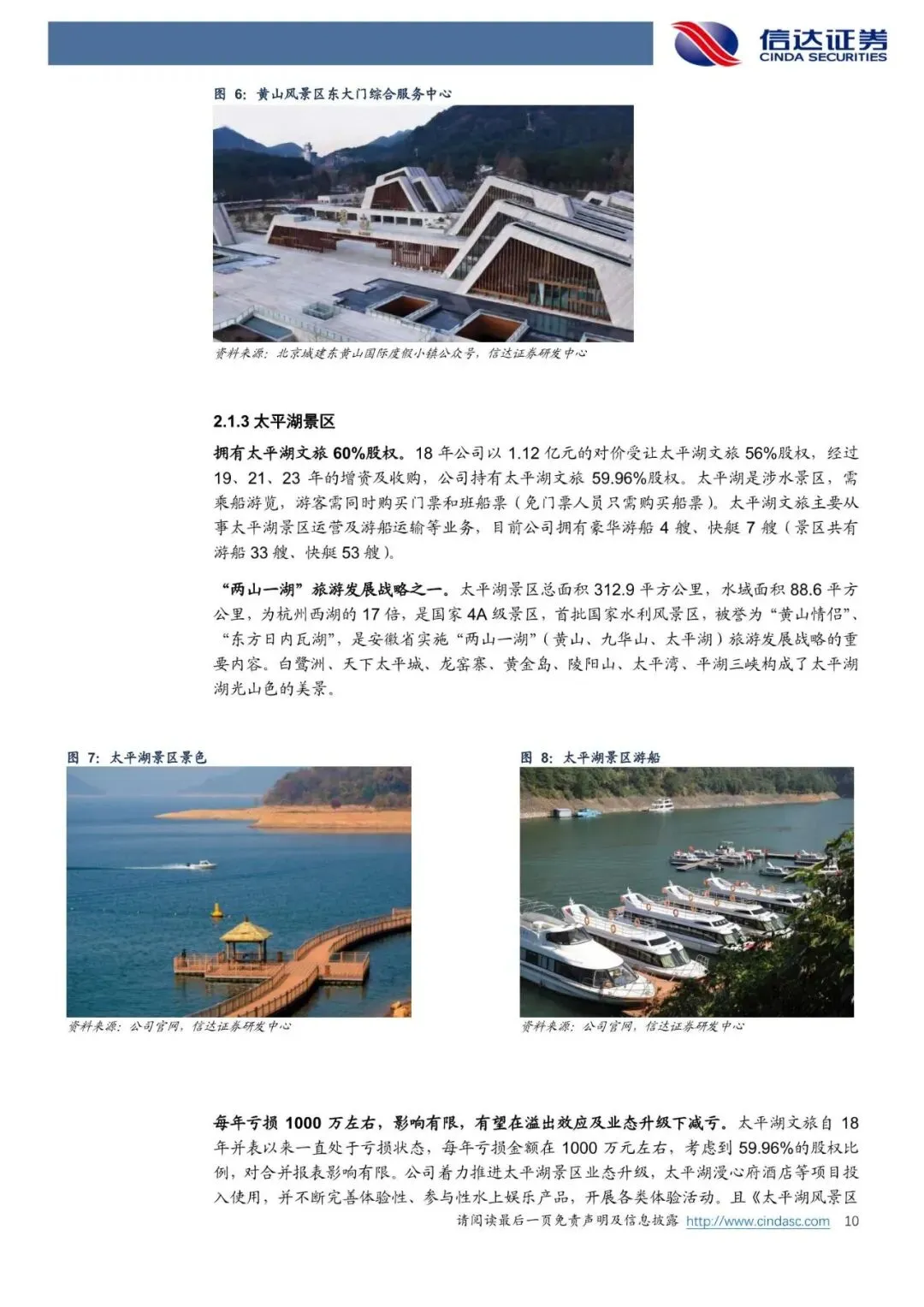 依托名山景区资源;完善旅游产业链布局。公司围绕核心景区黄山景区,构建涵盖景区(黄山、花山谜窟及太平湖)、索道缆车(黄山云谷、玉屏、太平索道和西海观光缆车)、酒店(山上 8 家、山下 4 家)、徽菜、旅行社、智慧旅游业务的旅游全产业链布局。