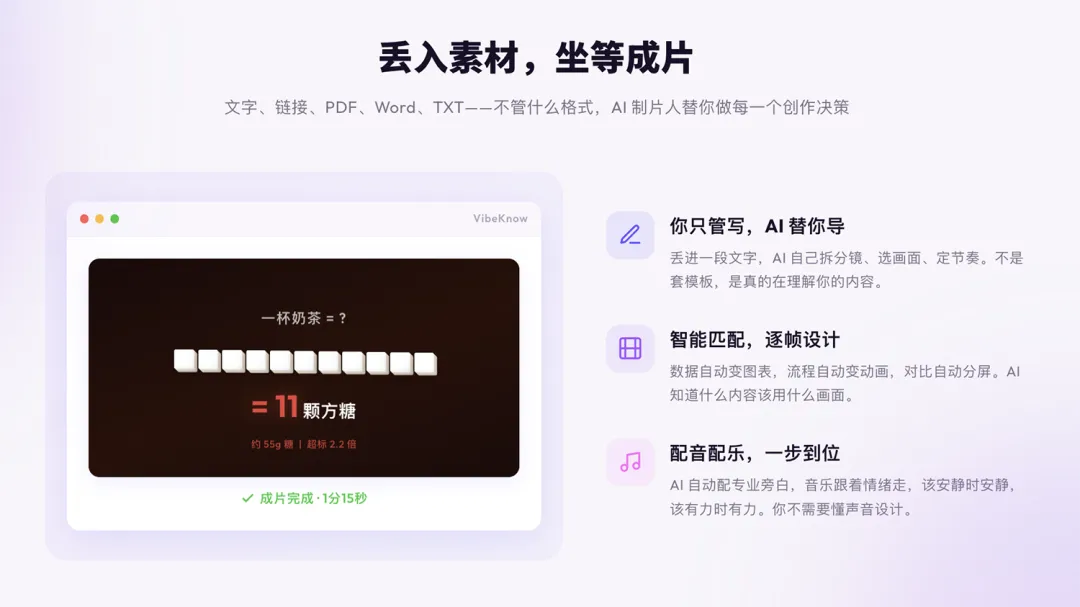 丢文档/链接/PDF/Word → AI自动分镜+画面+配音+配乐 → 几分钟出高质量知识视频