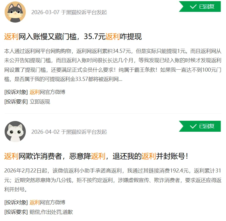 黑猫投诉大量投诉集中在:高额返利无法提现、隐藏门槛、诱导消费。后期给的返利金额比例感人,可能买上千元东西还不够,平台拉新,给用户的补贴看起来大方实际上却让用户轻易提现不得,只接受消费实力强劲的用户。用高额补贴做诱饵,用高提现门槛做枷锁,看似最划算,实则最坑人。吃相十分难看。