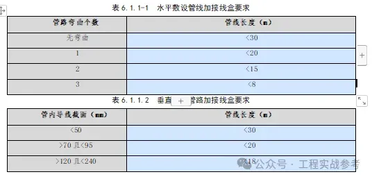 7)水平敷设线管加接线盒要求见表6.1.1-1,垂直敷设线管加接线盒要求见表6.1.1-2。