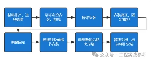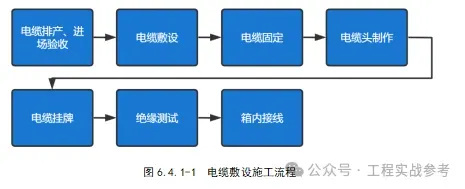 桥架安装完毕,保持良好接地状况,同时在机房设备和各类配电箱就位后,将电缆盘运送到需要作业的楼层,电缆盘固定良好后开始施工,采用“逐层分段,以配电室为中心,向各类配电箱展开”的原则进行敷设,电缆施工流程如图6.4.1-1所示。