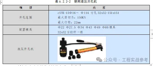 1)桥架与少量管连接时,采用液压开孔机(如表6.2.2-3)开孔,管与桥架的连接方式同管与配电箱的连接,并可靠连接,确保接地可靠。