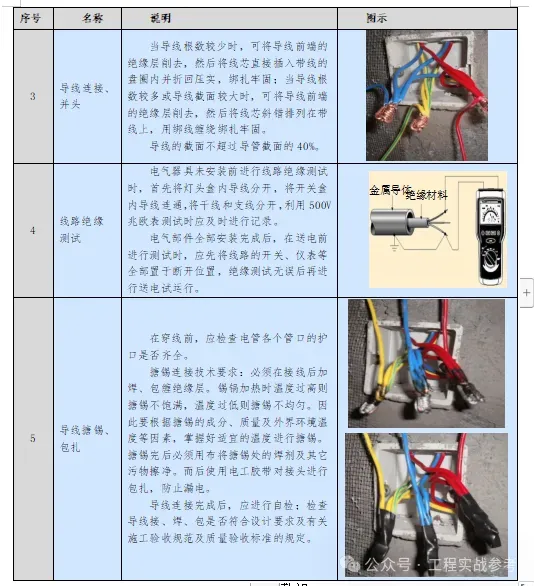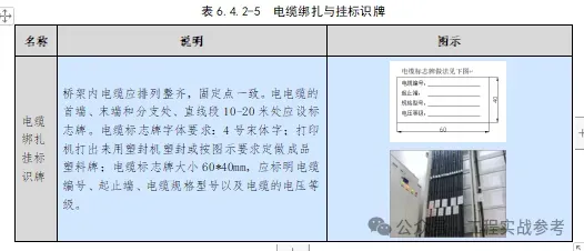 电缆敷设完毕以后,进行电缆绑扎及挂标识牌工序,主要要求见表6.4.2-5。
