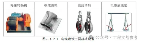 1)电缆施工主要选择人力敷设和机械敷设相结合的方式进行,主要机械设备为:5T慢速卷扬机、电缆滑轮机组和电缆放线架等,如图6.4.2-1所示。