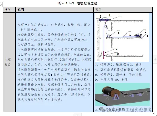 在卷扬机就位后,各层配电室设置专人看管,对讲机保持畅通,较长电缆线路,每层设置2人在电缆井处,待电缆就位后进行固定。电缆具体敷设过程见表6.4.2-3。