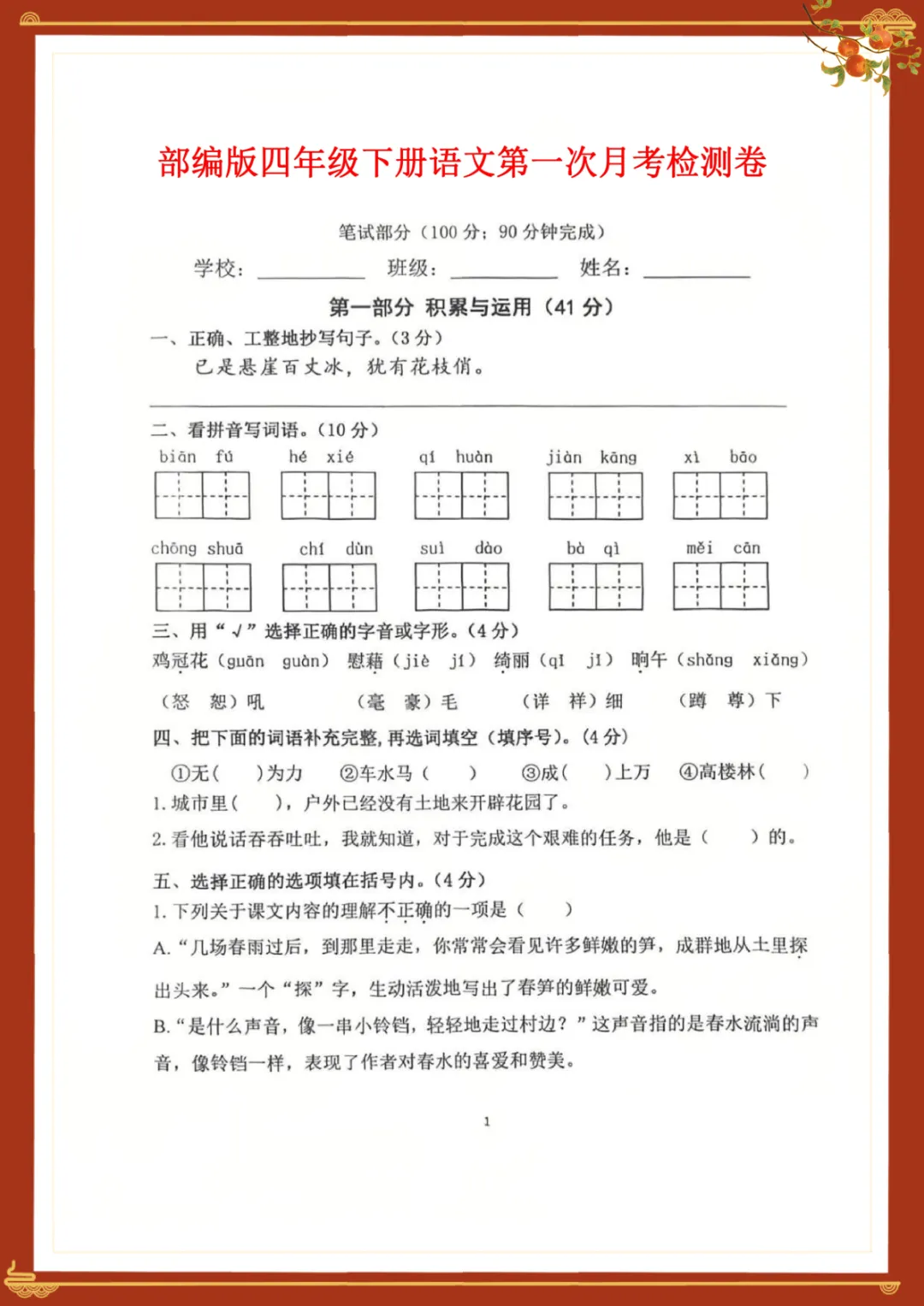 部编版四年级下册语文第一次月考检测卷 电子版可下载