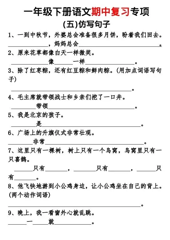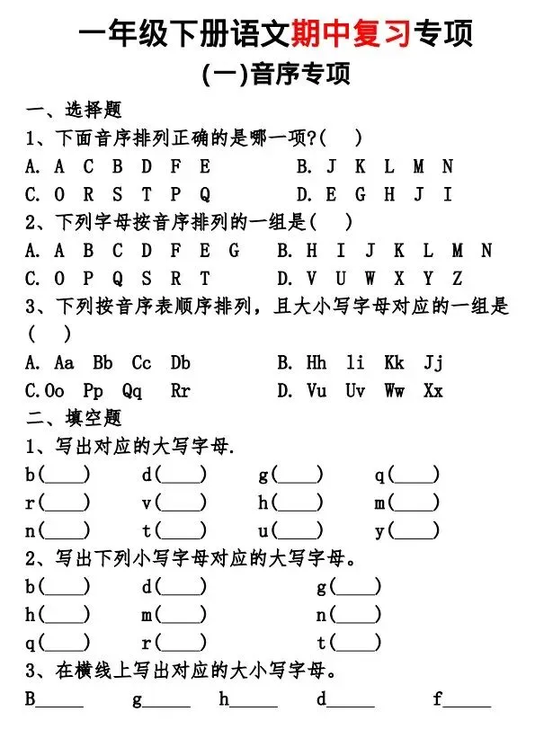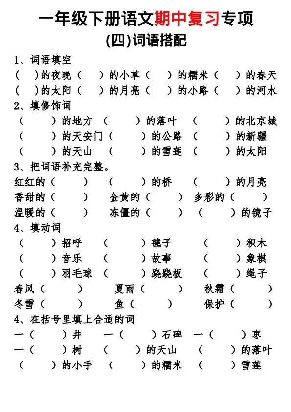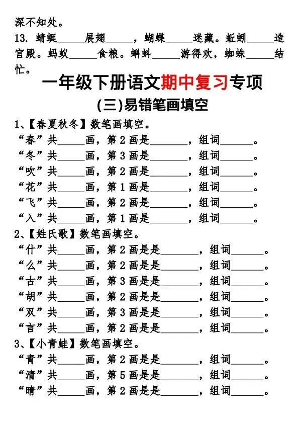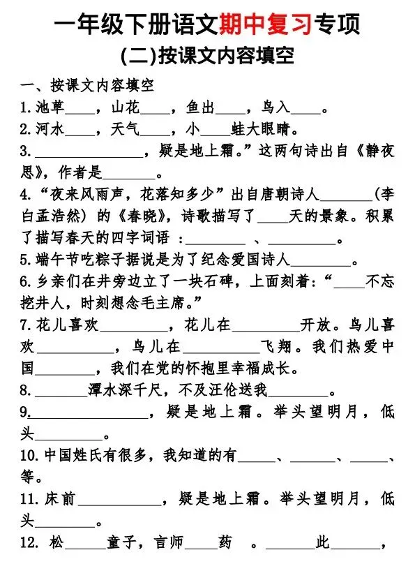 今日分享一年级下册语文期中复习专项(完整电子版可打印)!高清电子版可直接打印,排版规整适配练习,不用费心整理,孩子每日一练夯实基础,家长辅导省心!