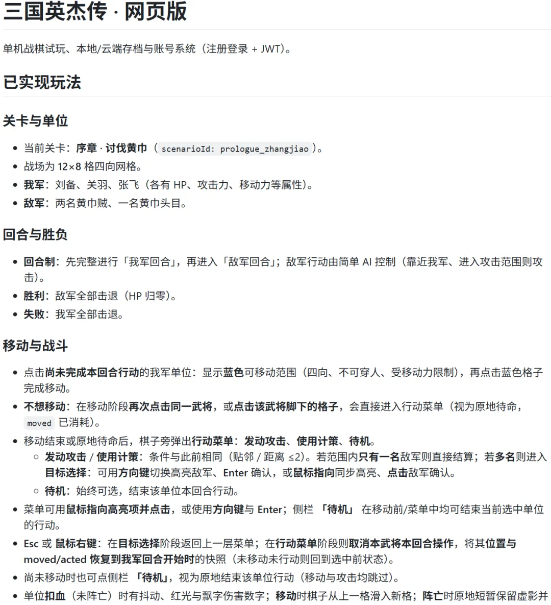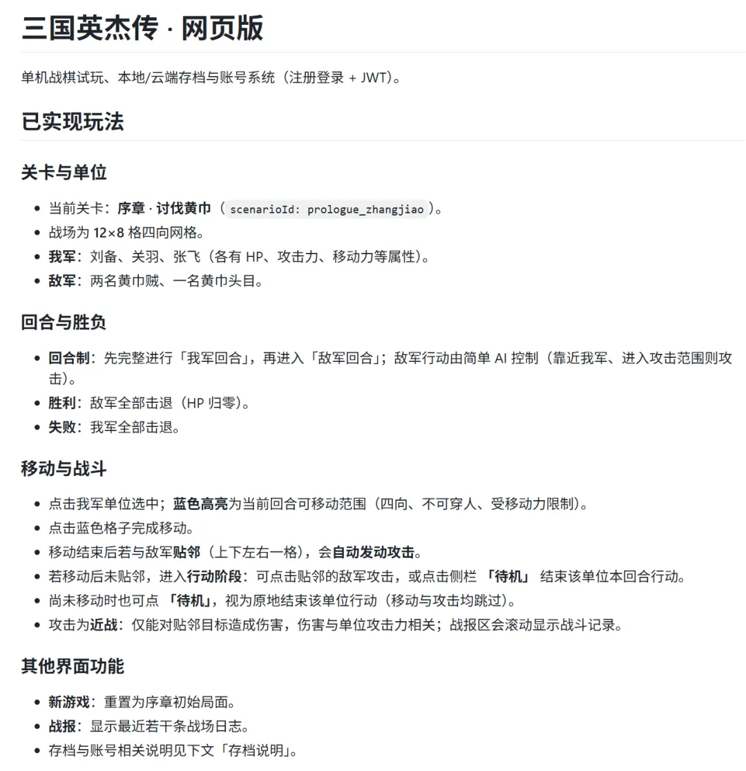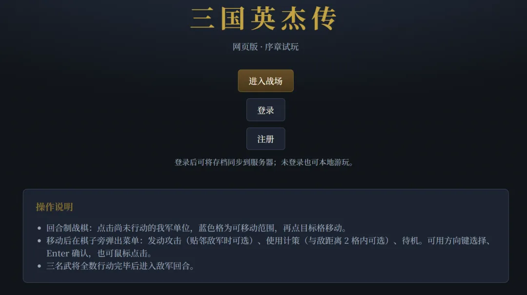 帮我在这个项目里面做一个网页版的《三国英杰传》,要求:1. 单机版可以玩2. 搭好网页版框架,可以存储,加载记录,可以通过注册登录账号来识别用户