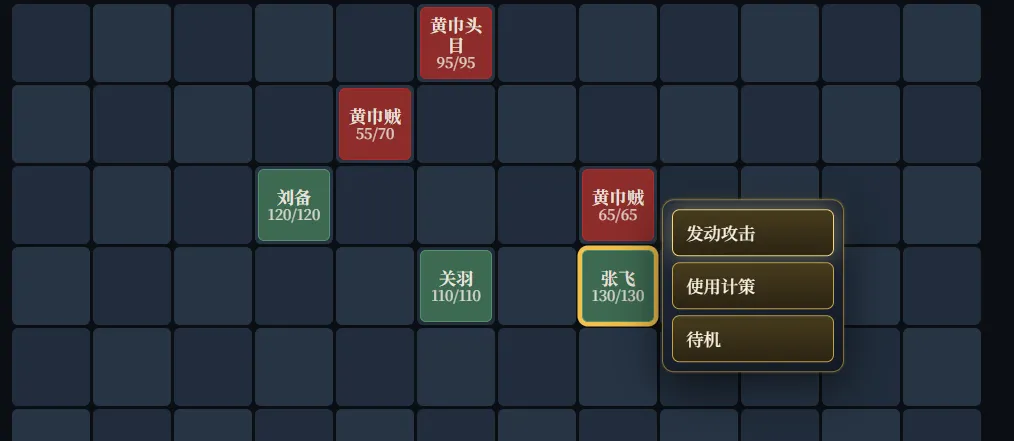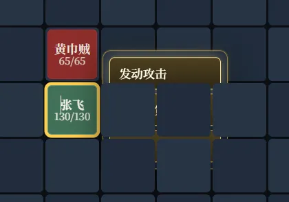 修改玩家交互方式,1. 当没行动过的玩家被点击时,显示可移动区域。2. 当移动完后,自动在棋子旁边弹出菜单:发动攻击(如果和敌方相邻,则亮色,否则灰色),使用计策(如果和地方距离在2以内,则亮色,否则灰色),待机。玩家可以通过移动鼠标和键盘来选中执行哪个菜单3. 扣血时有比较牛叉的动画效果