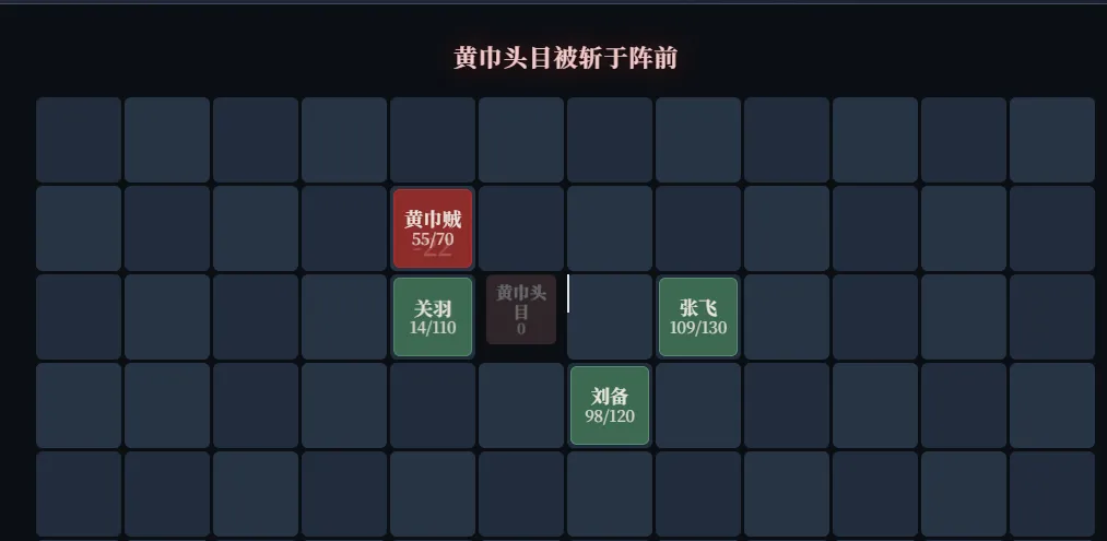 效果还不错。当敌方被阵斩后,出现渐隐动画和提示文字“黄巾头目被斩于阵前”。