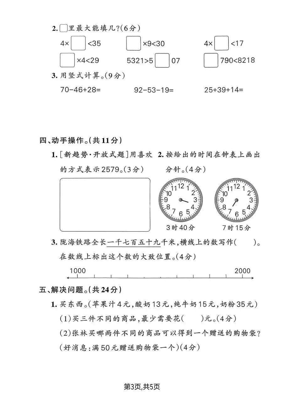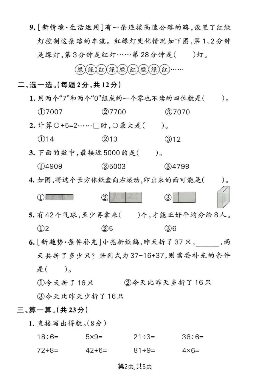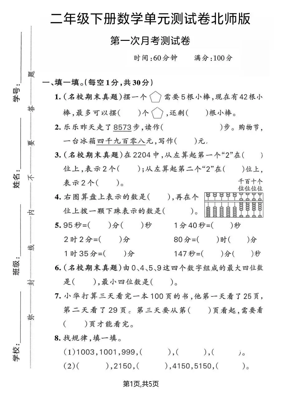 二年级下册数学第一次月考测试卷《北师版》电子版免费下载!