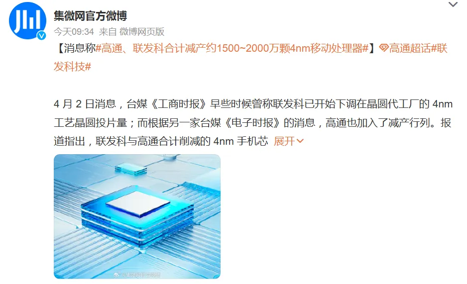 高通、联发科合计减产约1500~2000万颗4nm移动处理器