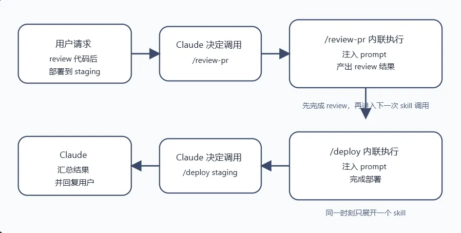 好处:Claude 能看到完整的对话历史。你可以说”按照我们刚才讨论的方案,用 /deploy 部署”,Claude 知道”刚才讨论的方案”是什么。