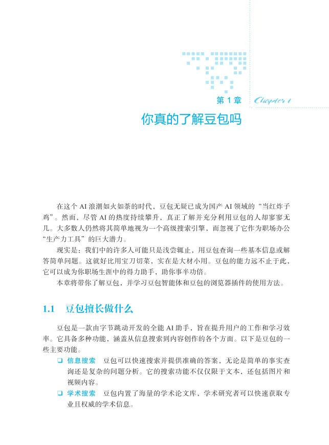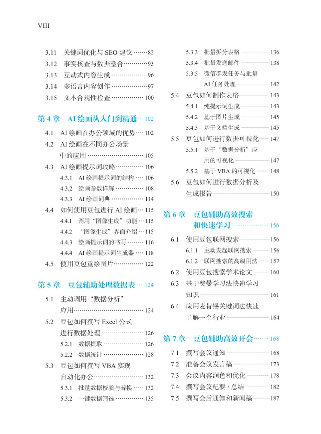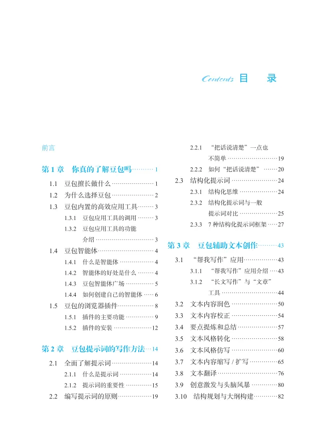 本书首先从一个行家的视角全面介绍了豆包、豆包内置应用、豆包浏览器插件的功能和使用方法,为读者打下AI基础;然后,详细讲解了自创的提示词编写原则、思维方法,以及7种好用的结构化提示词框架,为你构建好通往AI世界的桥梁。