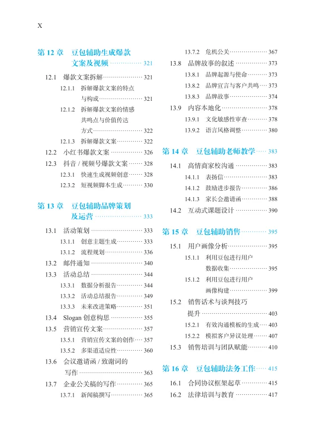 本书针对文本创作、绘图、数据处理、信息收集与获取、撰写会议材料、做计划、写总结、文献阅读、论文写作、公文写作、项目管理、爆款文案写作等12个职场高频场景,以及品牌、公关、营销、运营、销售、教育、法务等7大重点行业提供了高效的AI解决方案;也授人以鱼,本书还提供了300余个案例和100余个提示词模板,可以拿来即用。