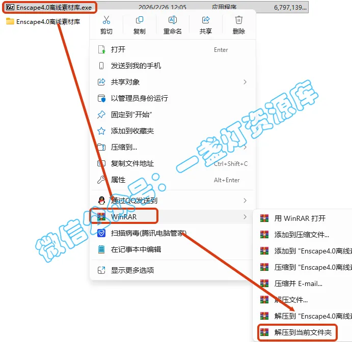 1.选中【Enscape4.0离线素材库】压缩包,然后鼠标右键选择【解压到当前文件夹】